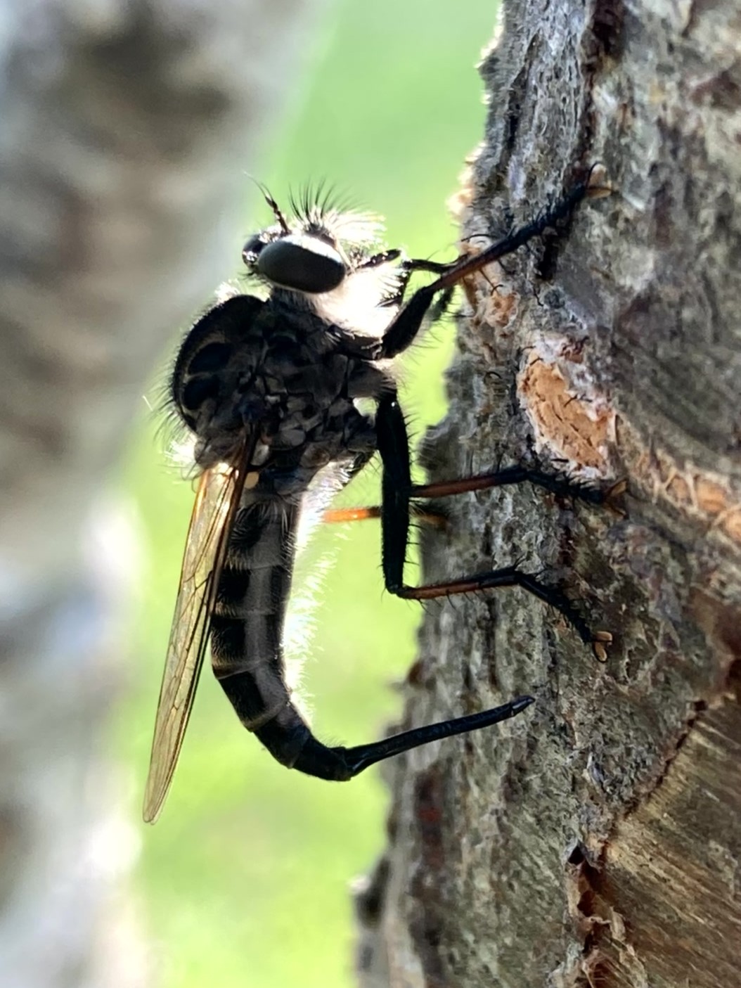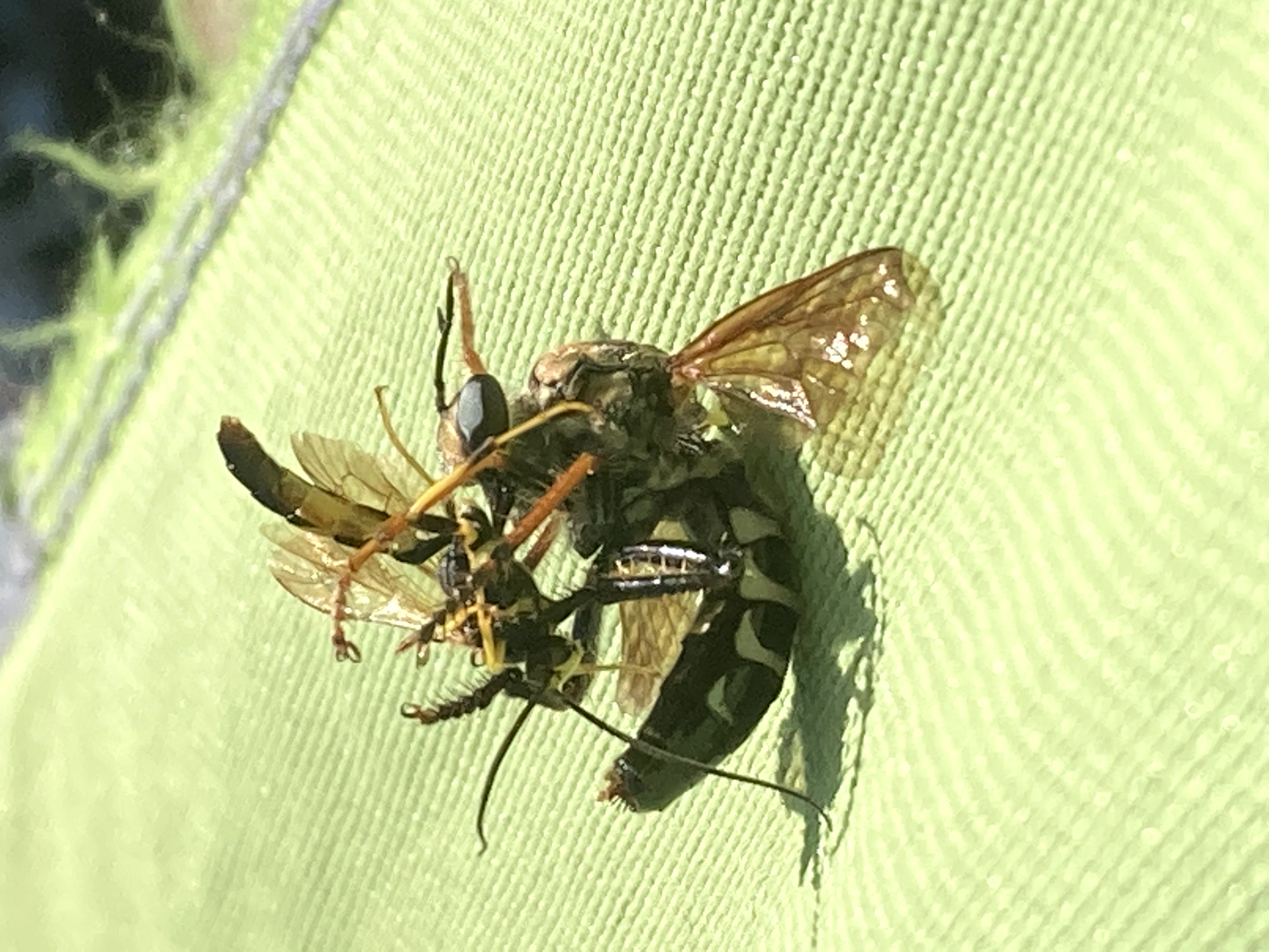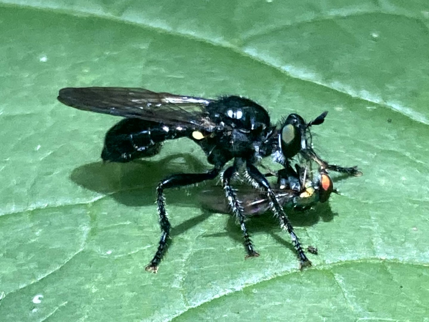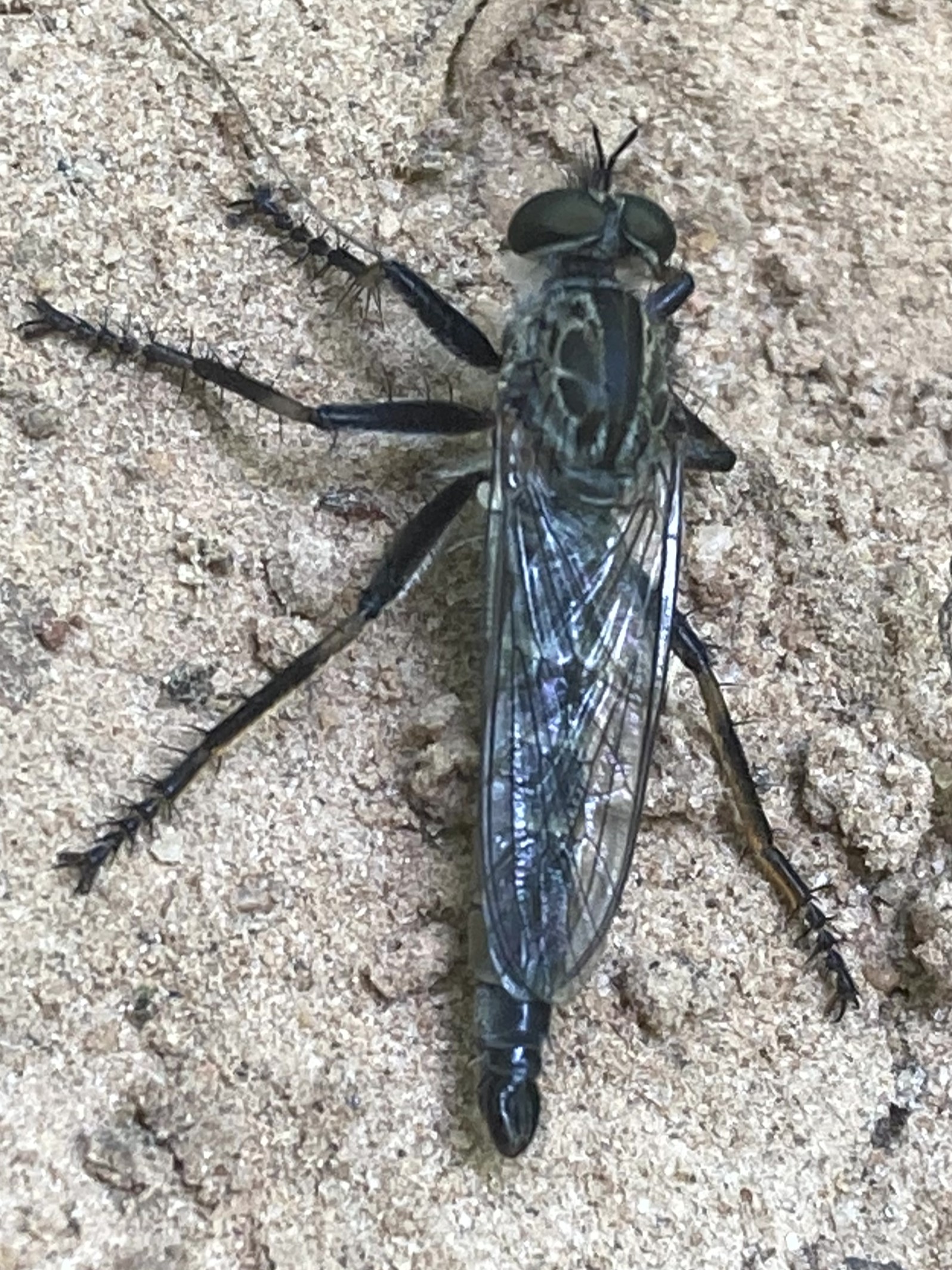 Mydas clavatusThis fly mimics the appearance and behavior of spider wasps with quick movements. The larvae feed on beetle larvae.