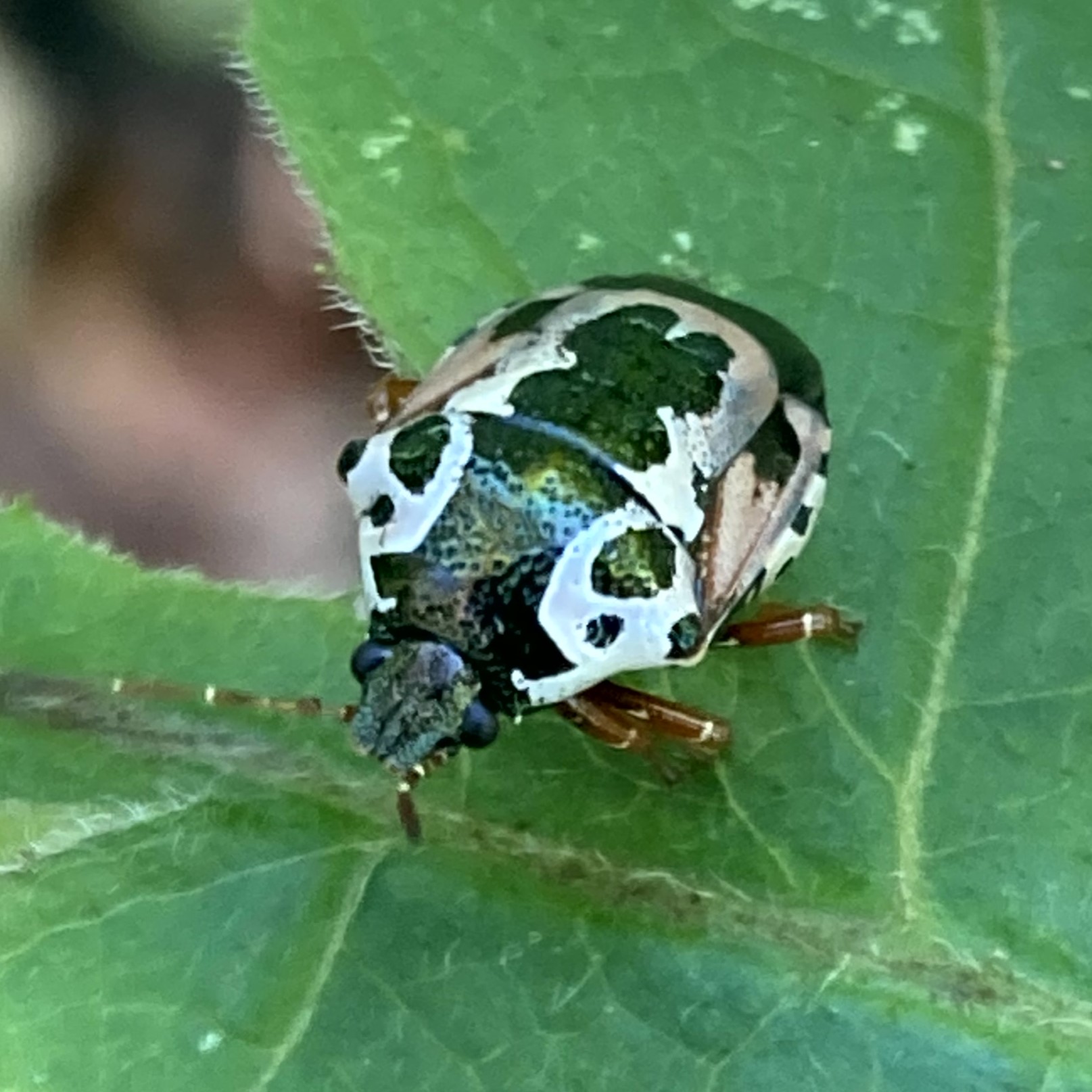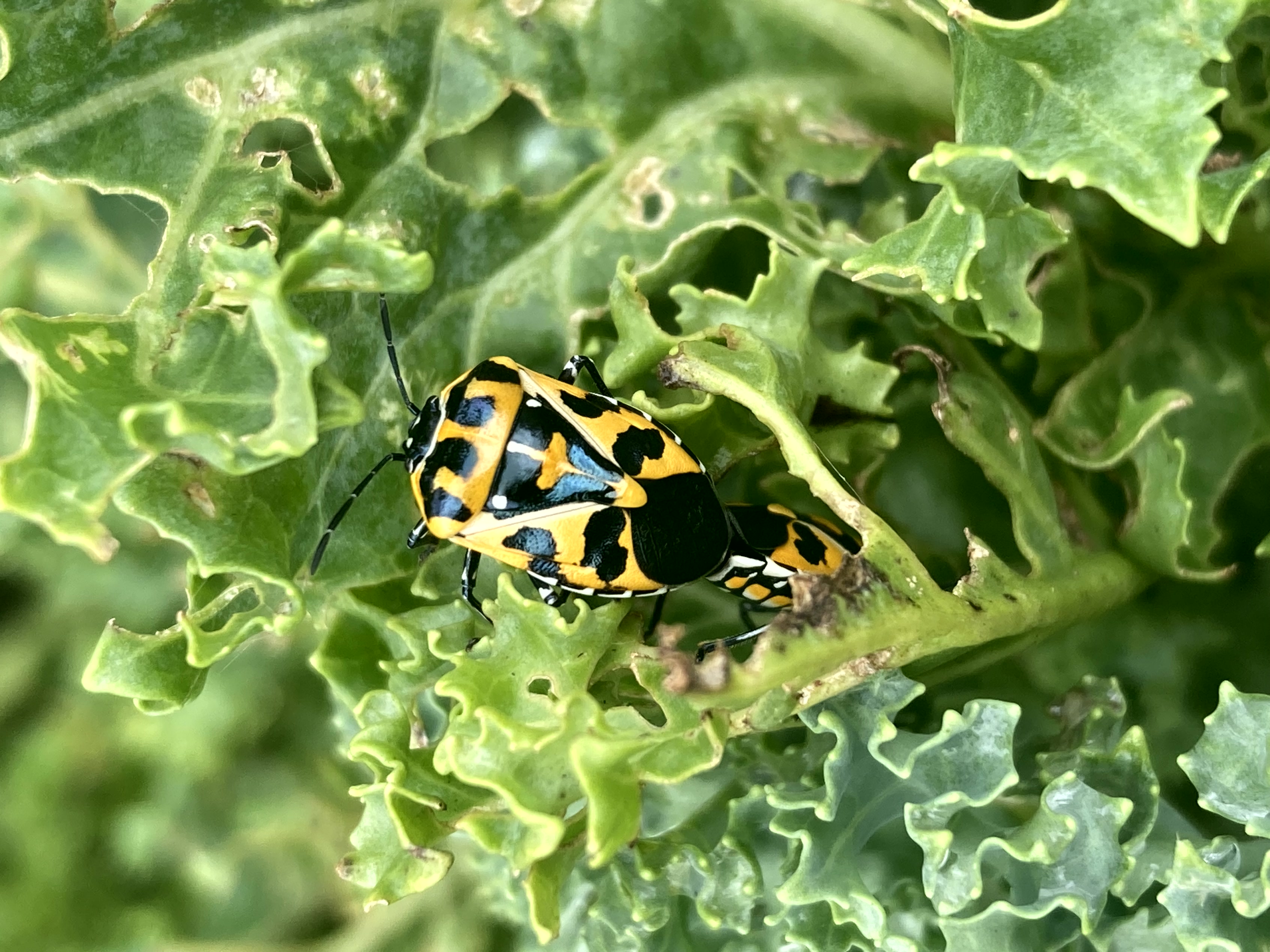 Murgantia histrionicaThis colorful bug is a common pest of plants in the Brassicaceae family including cabbage, kale, broccoli, mustard, etc. They store chemicals from the plants they feed on to defend themselves from predators. Seen here feeding on a kale plant.