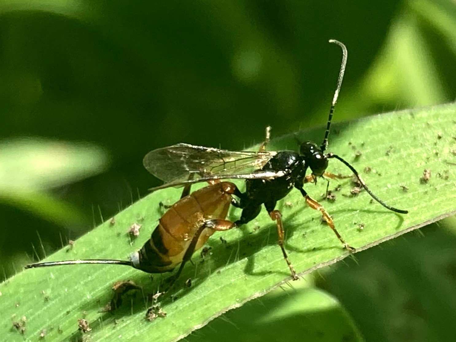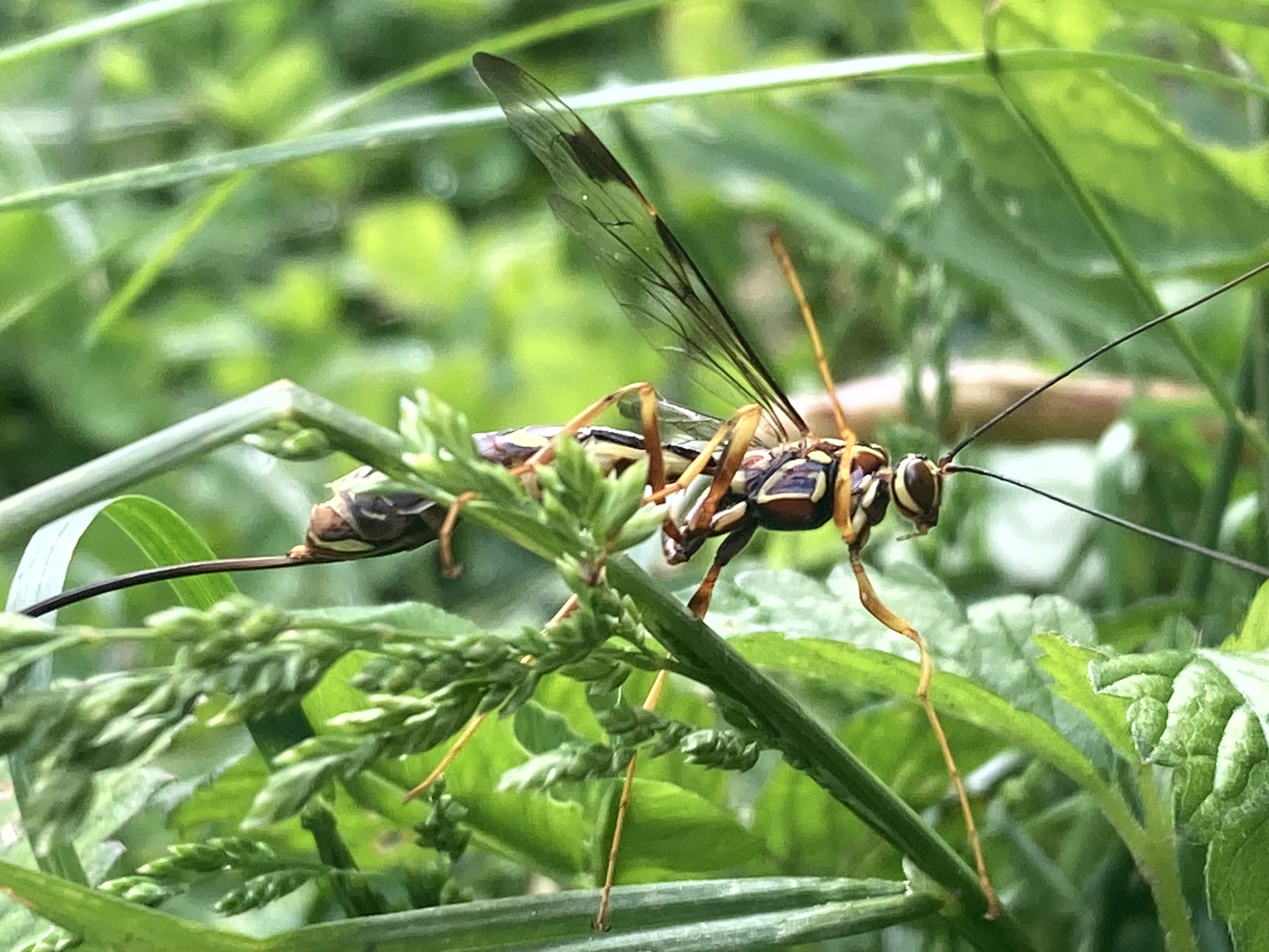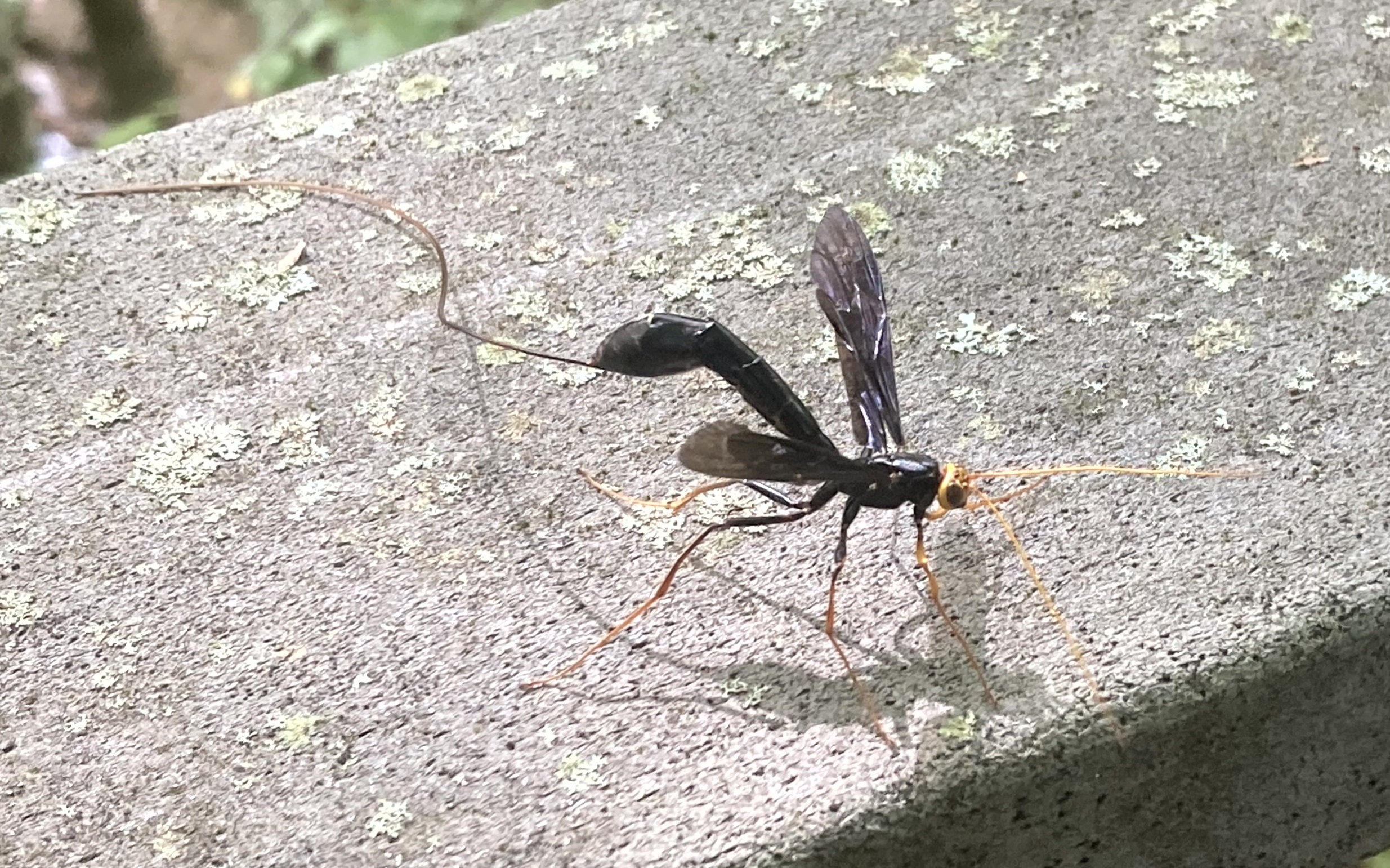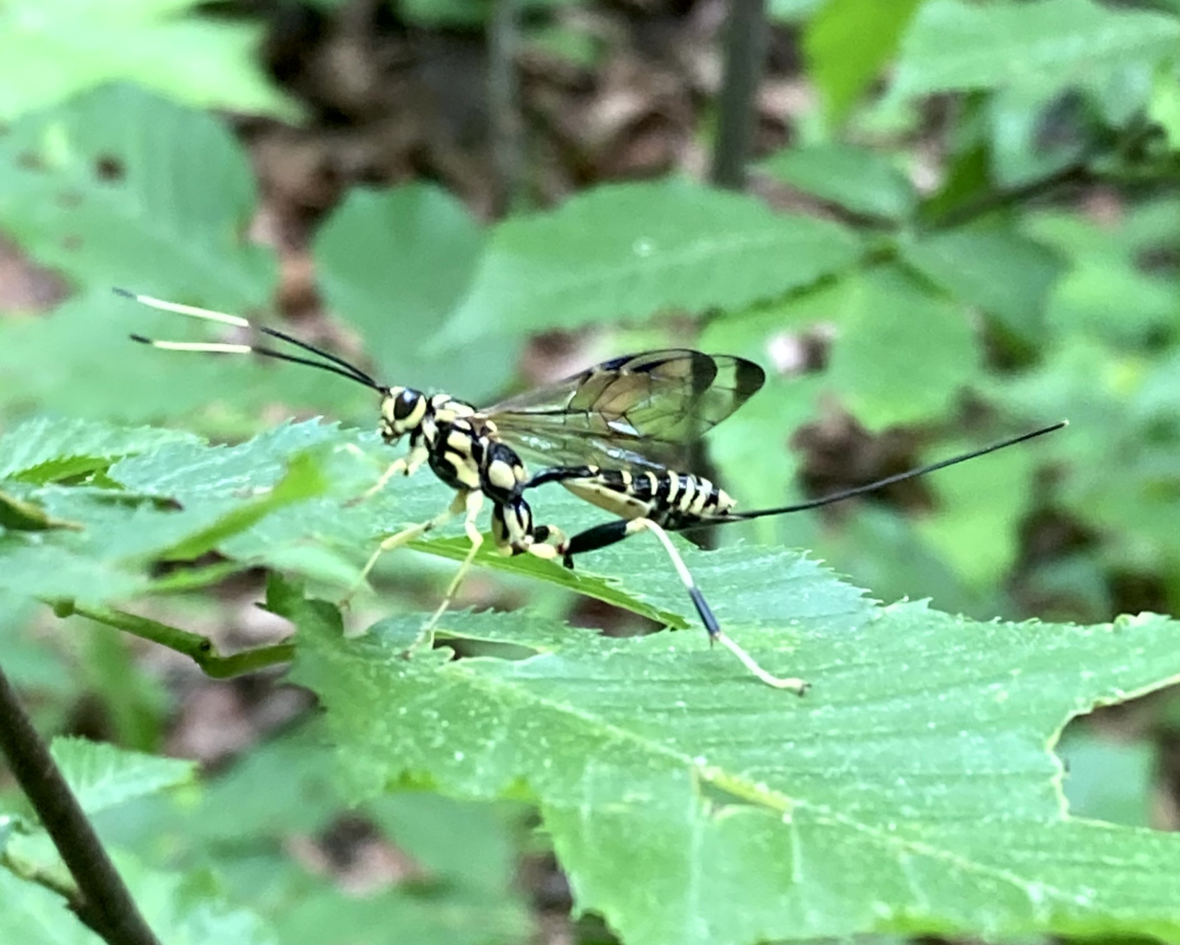Megarhyssa atrataThese wasps parasitize woodwasp larve (specifically those of *Tremex columba*) by using their long ovipositor to burrow deep within decaying wood.
