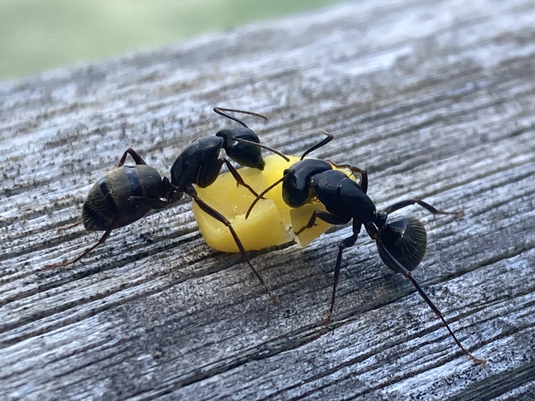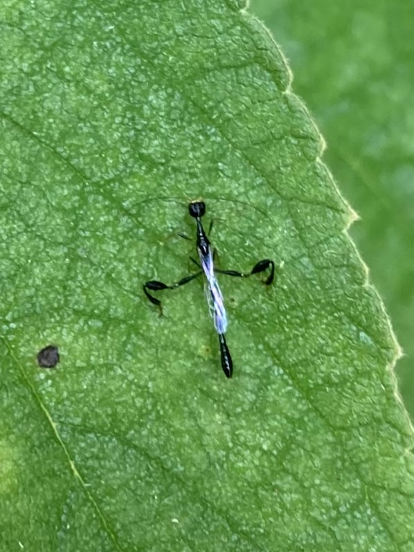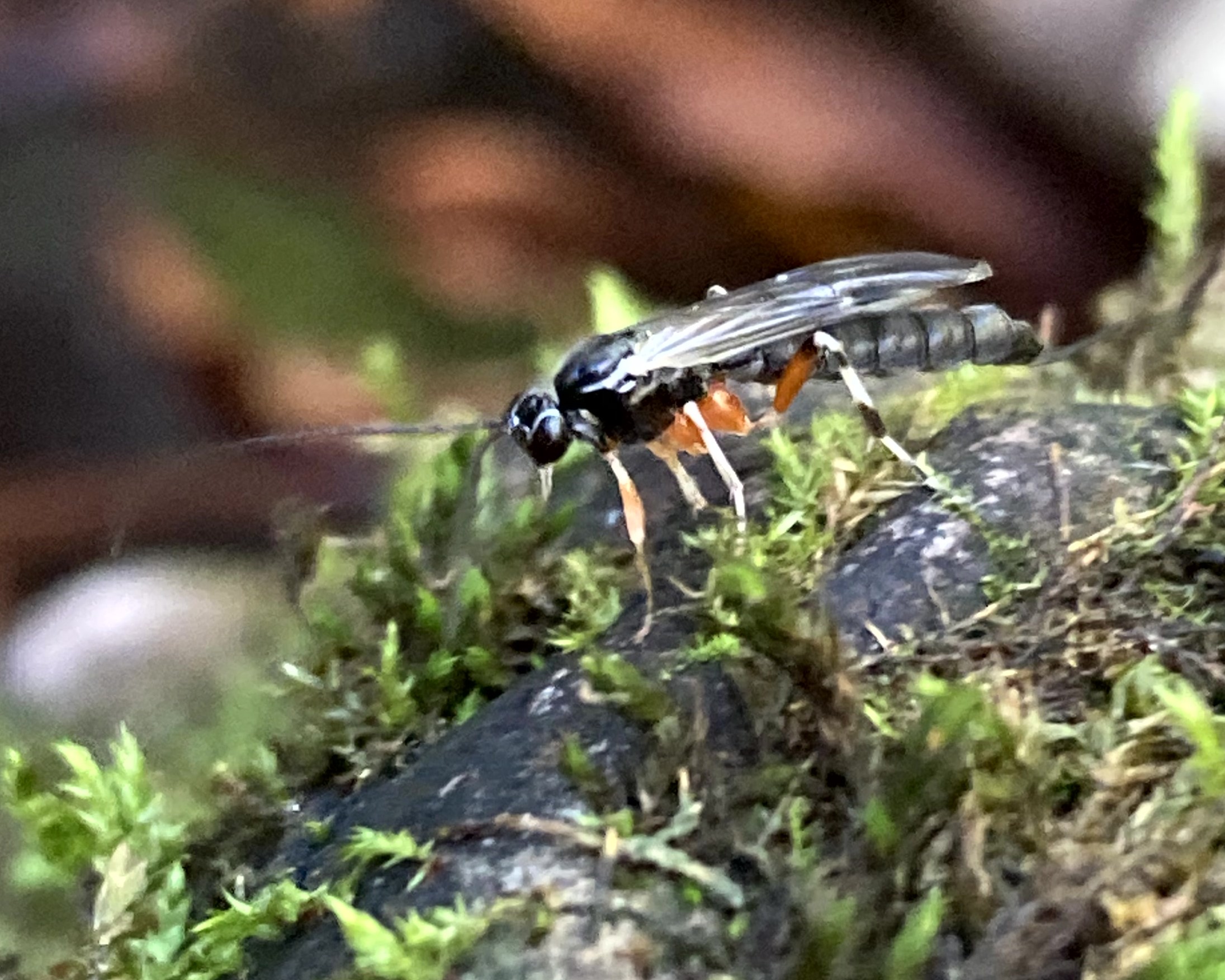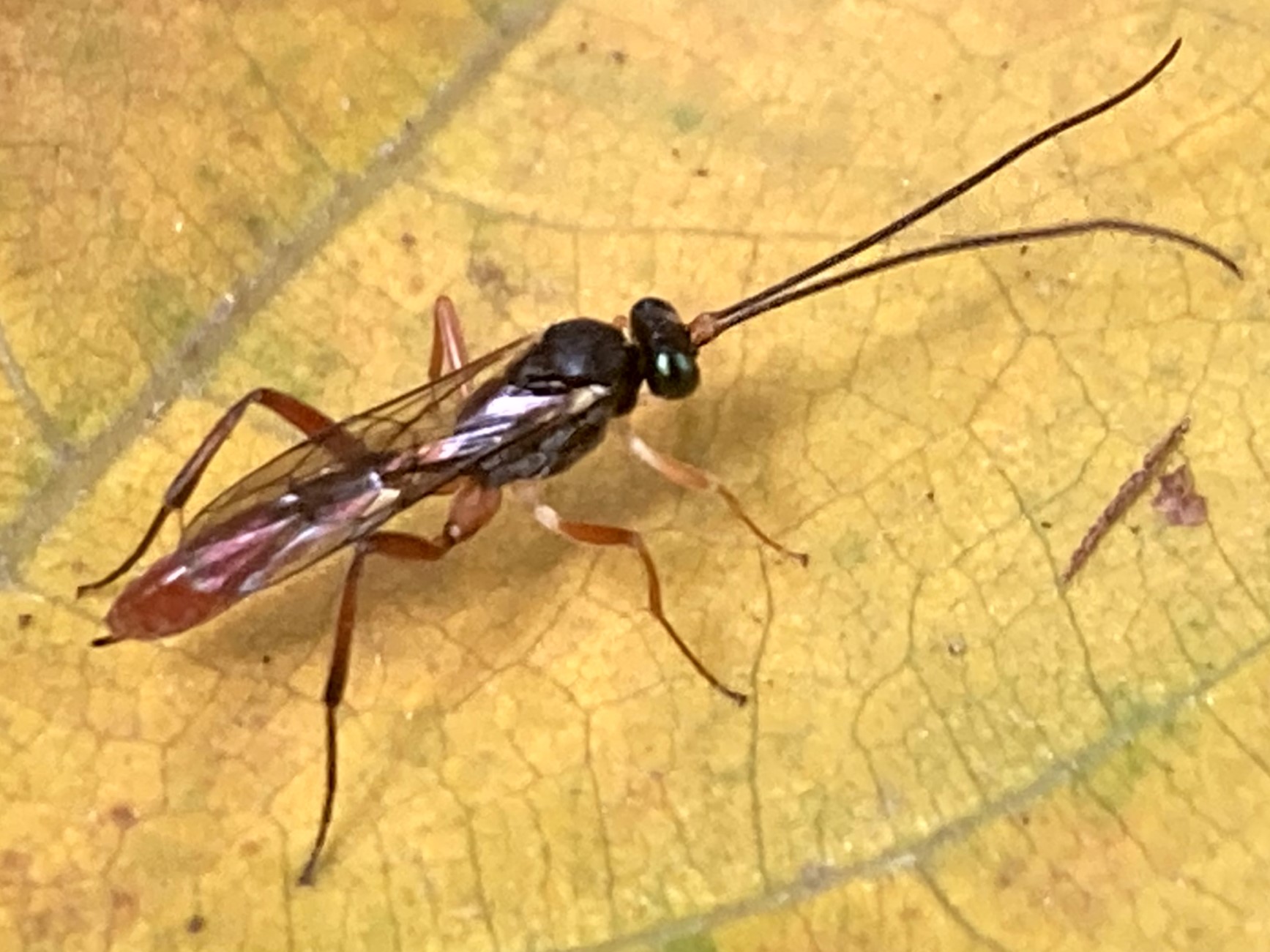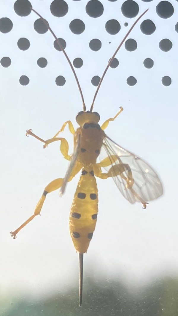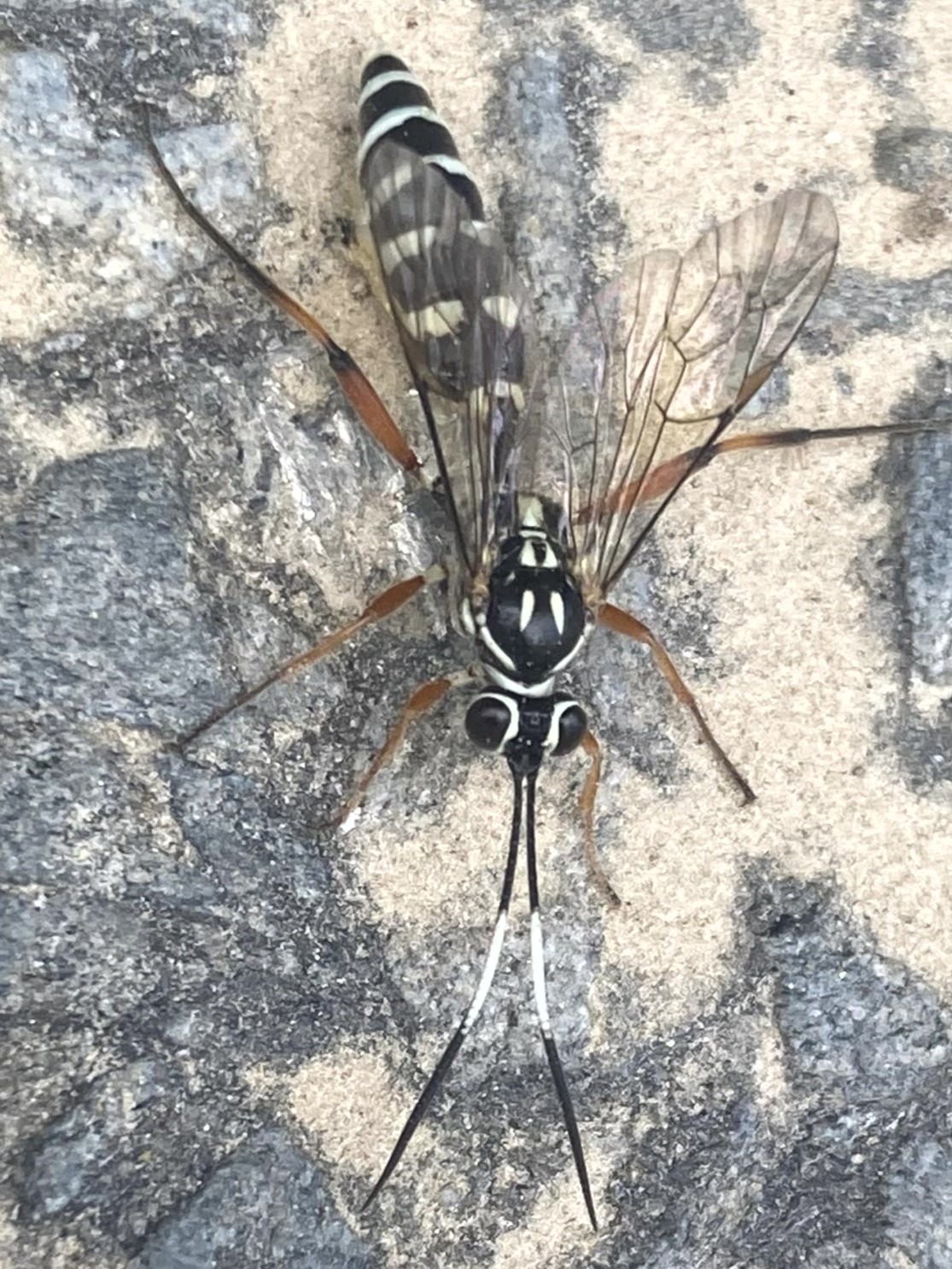 Megarhyssa atrataThese wasps parasitize woodwasp larve (specifically those of *Tremex columba*) by using their long ovipositor to burrow deep within decaying wood.