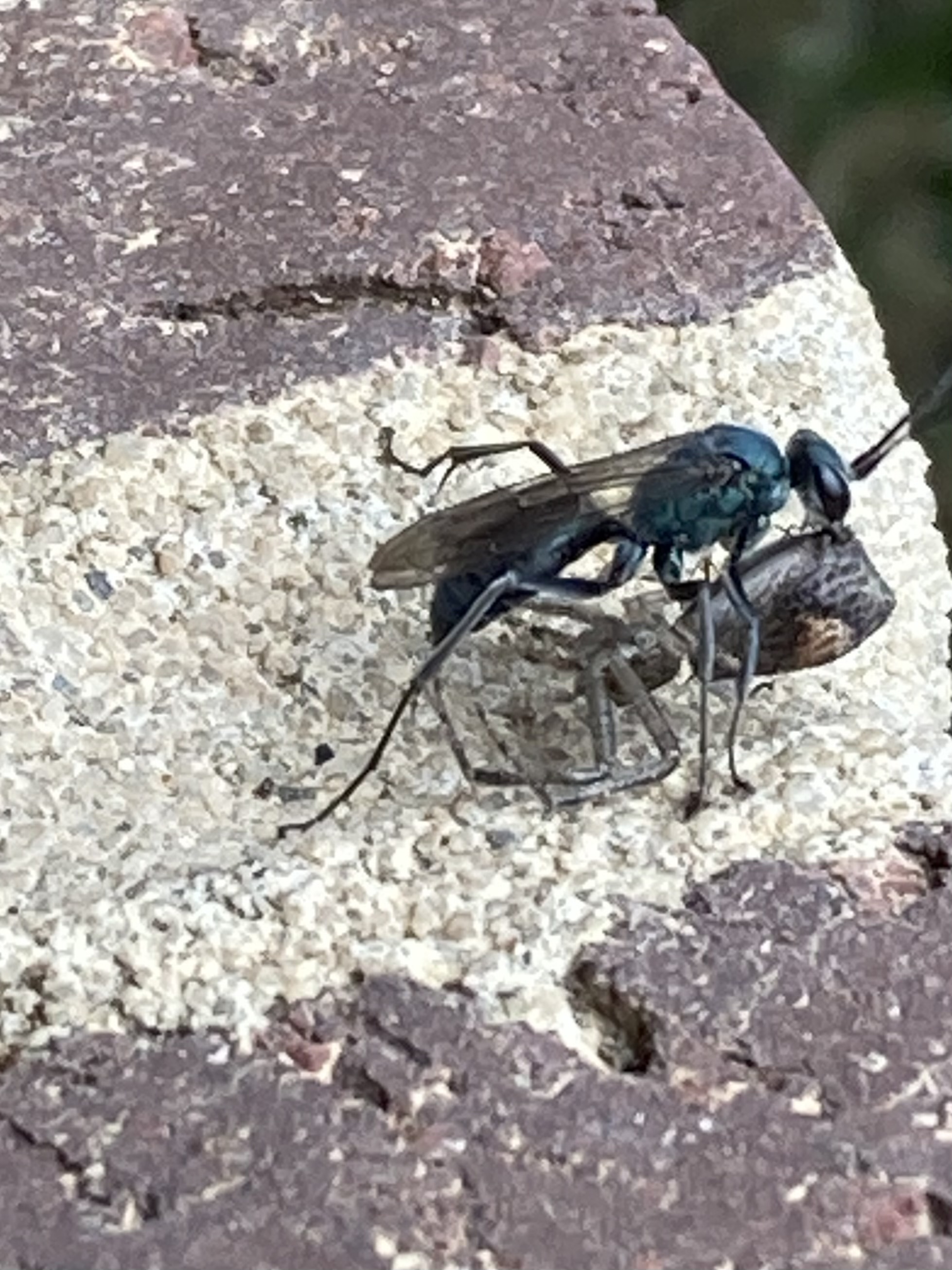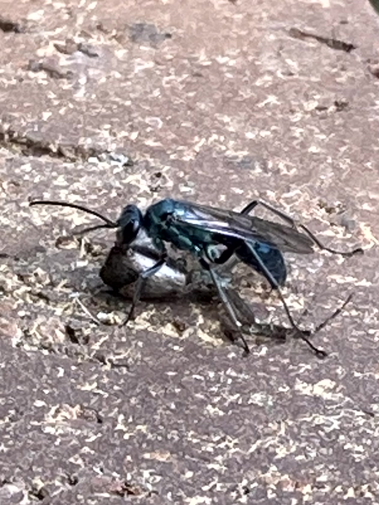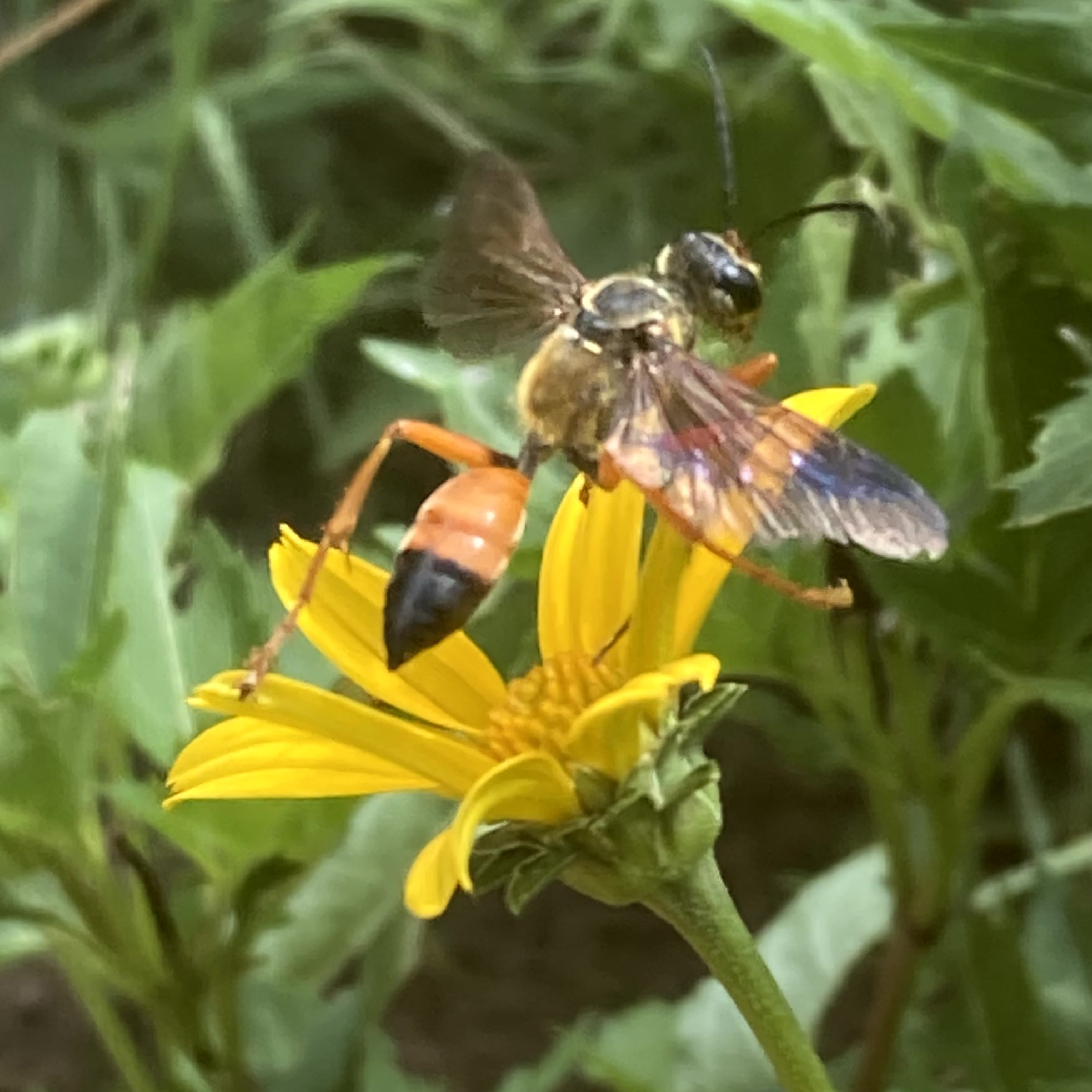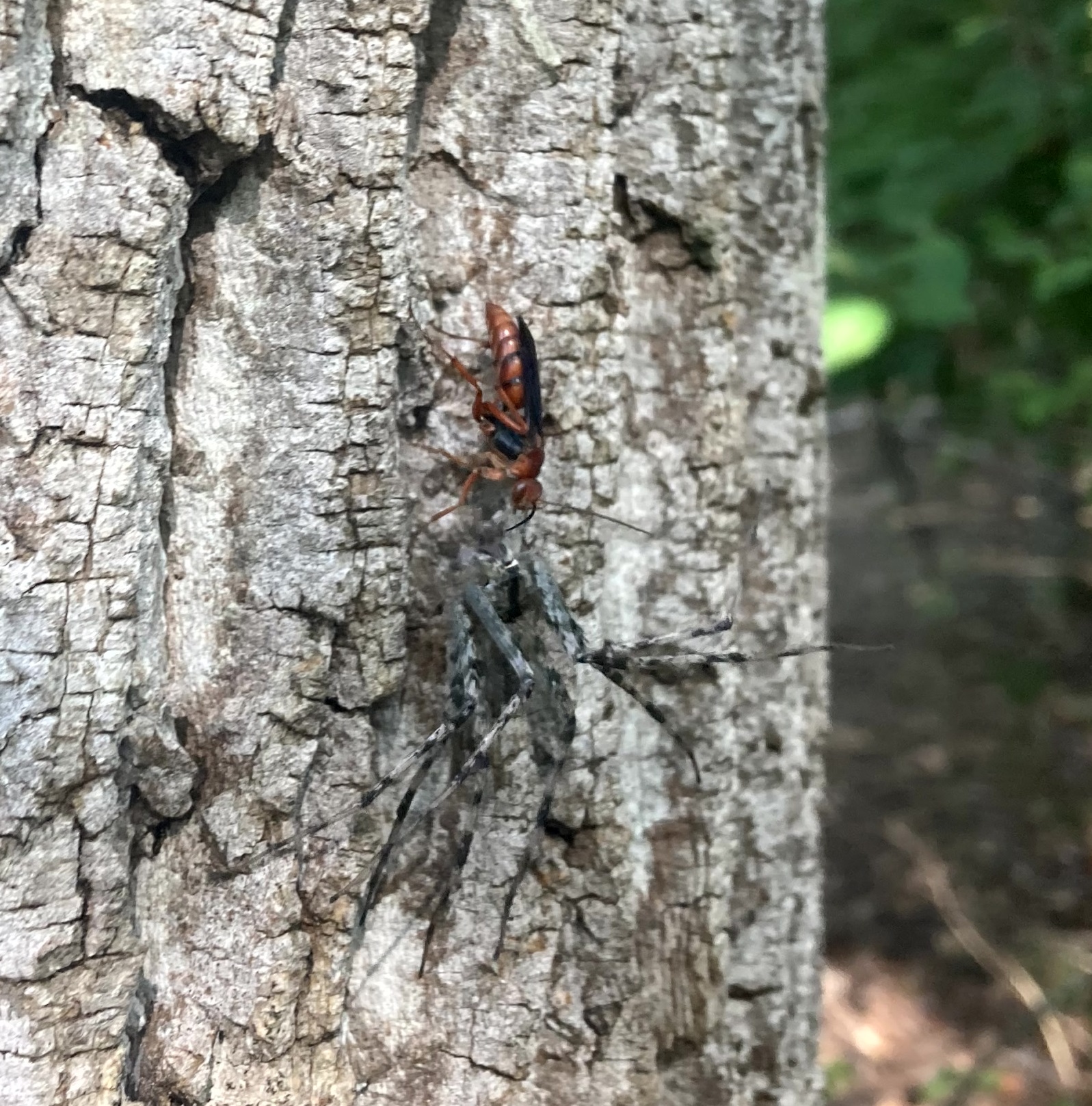Tachypompilus ferrugineusThis wasp captured a large wolf spider and carried it at least 50ft up the side of a tree.