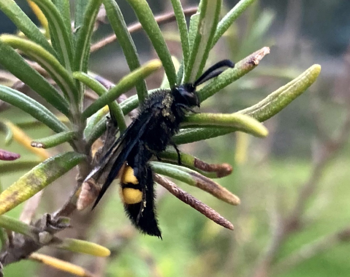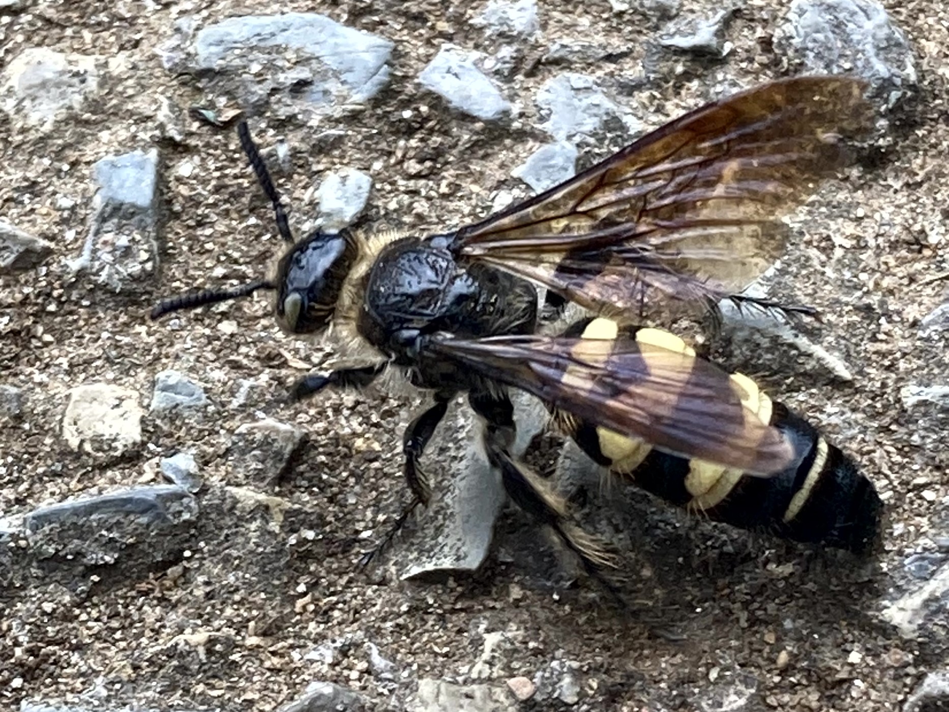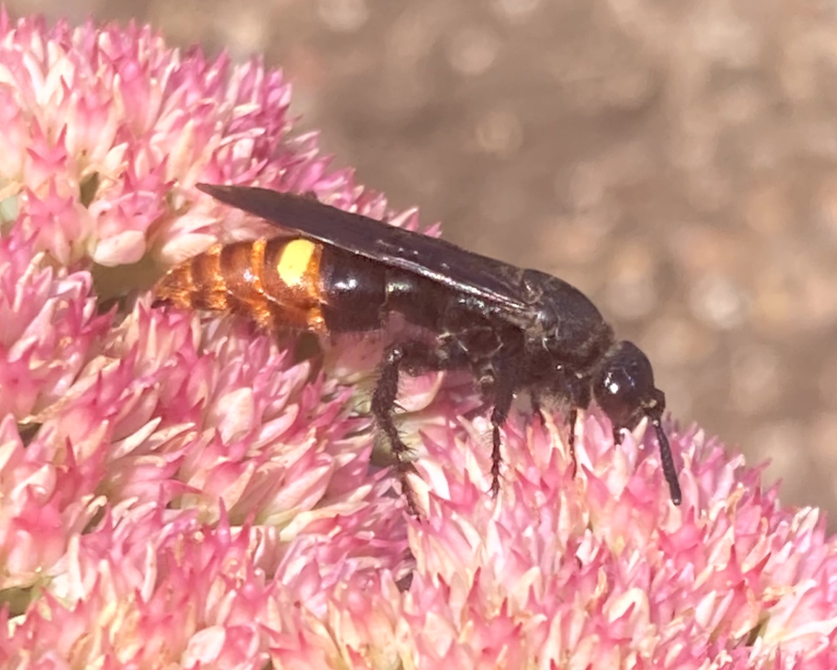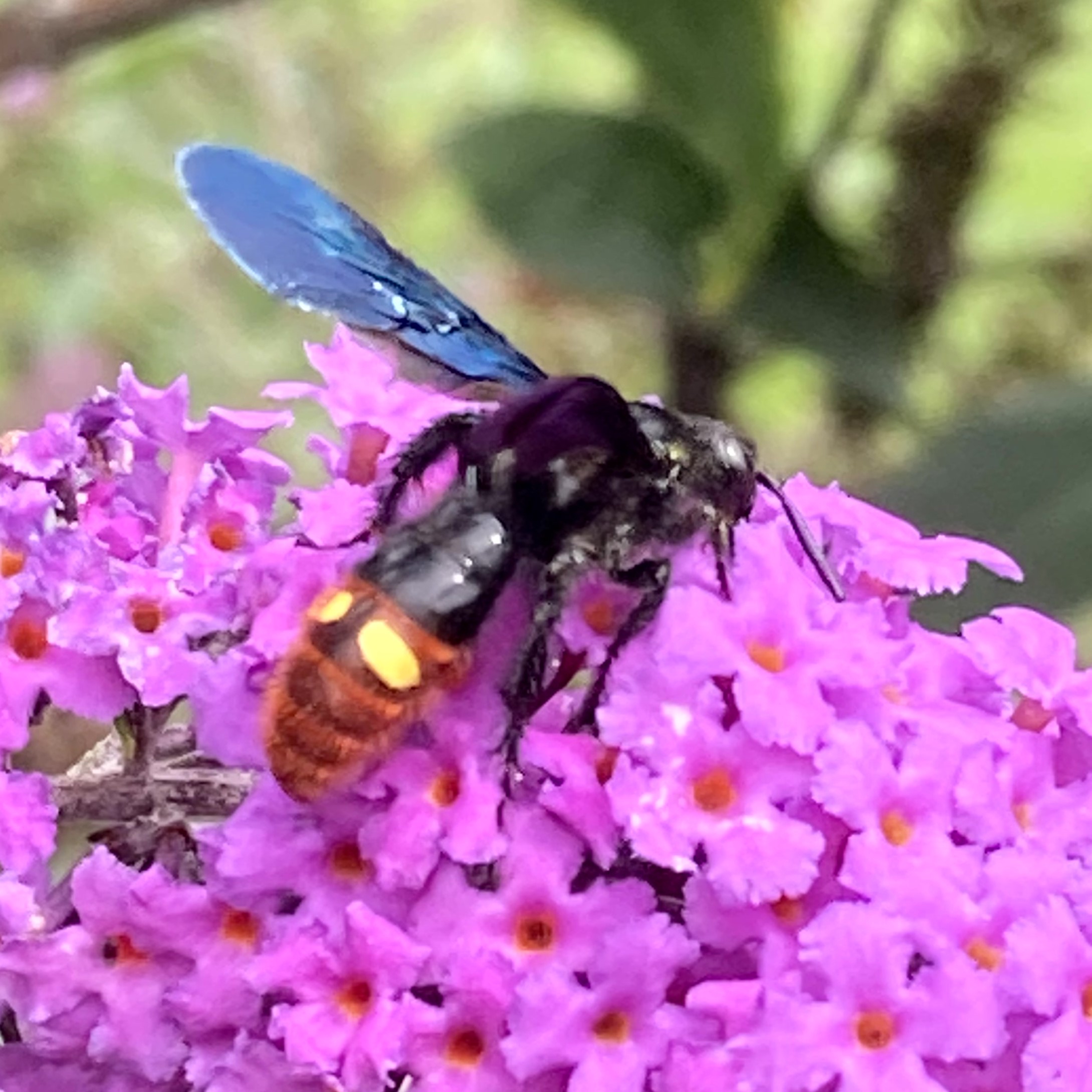 Scolia dubiaThe adults feed on flowers and dig in the ground in search of June beetle larvae to lay their eggs on.